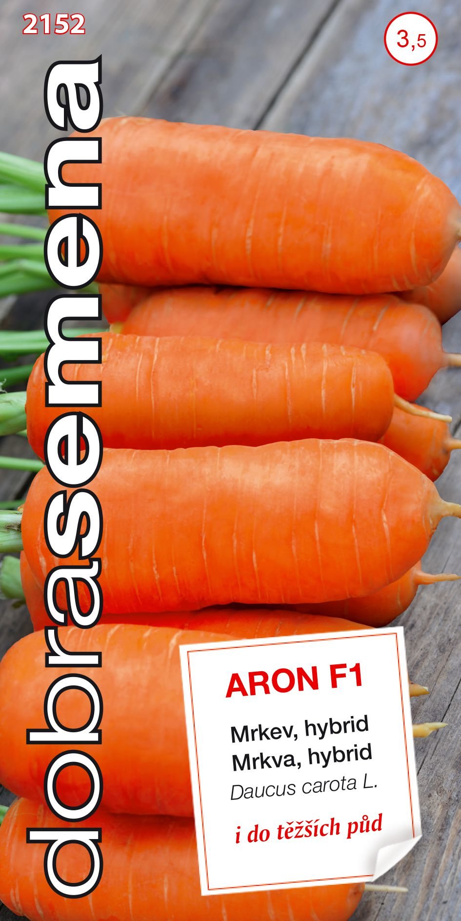 Daucus carota L. / Mrkva obyčajná praváPopis:ARON F1 - velmi raná hybridní mrkev s krátkým, pouze 10 cm dlouhým kořenem. Vhodná i pro pěstování v těžších půdách. Kořen je válcovitý, pravidelný, s tupým zakončením. Dřen i kůra kořene jsou oranžové, hlava kořene nezelená ani nefialoví. Odrůda je...