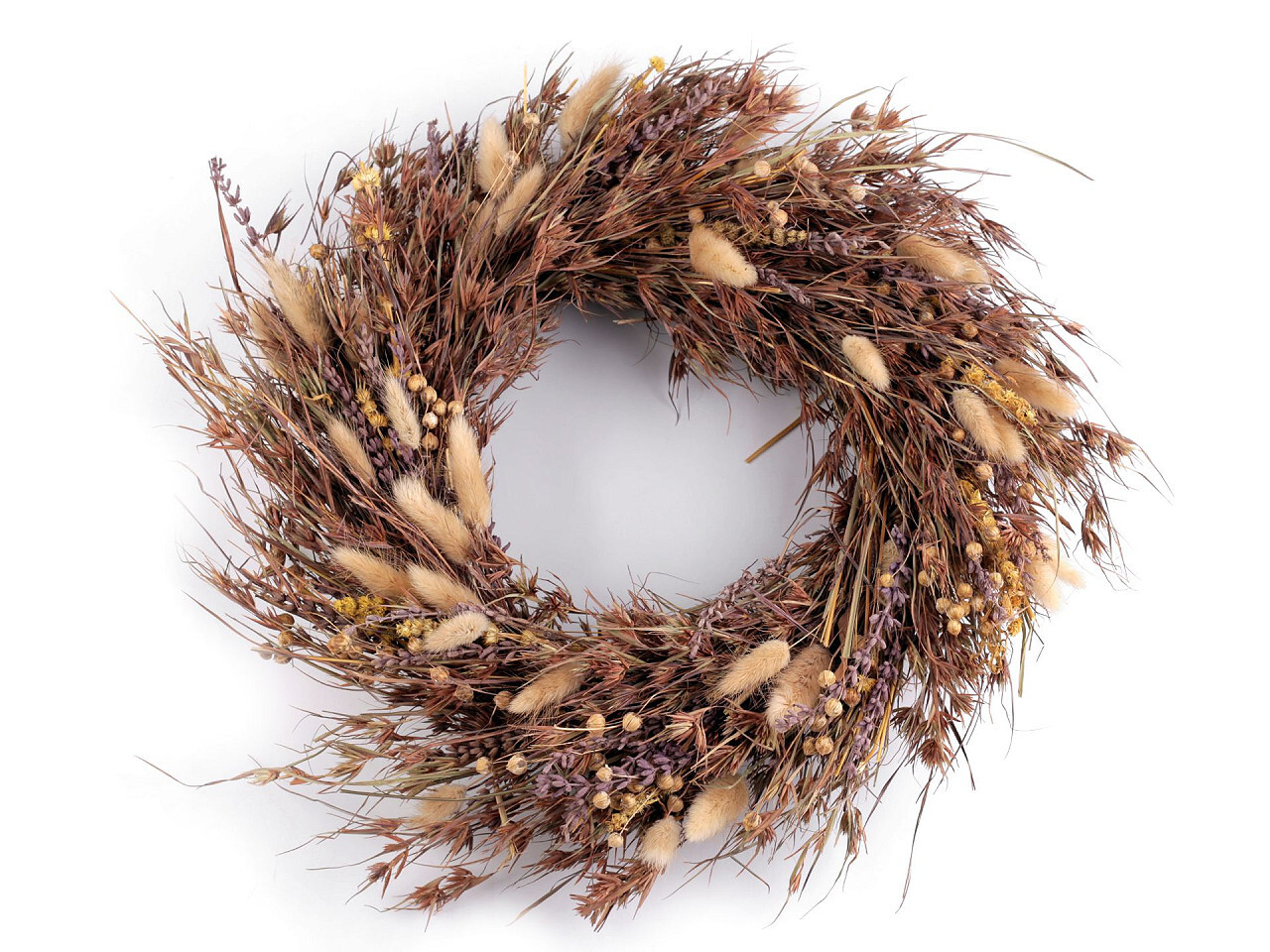 Dekorační věnec je bohatě zdobený přírodními sušenými travinami. Základ věnce je z přírodního proutí. Věnec je vhodný nejen k zavěšení na dveře či na zeď, ale také k položení na stůl. Zakomponujete ho do jakéhokoliv interiéru. prečítať celé