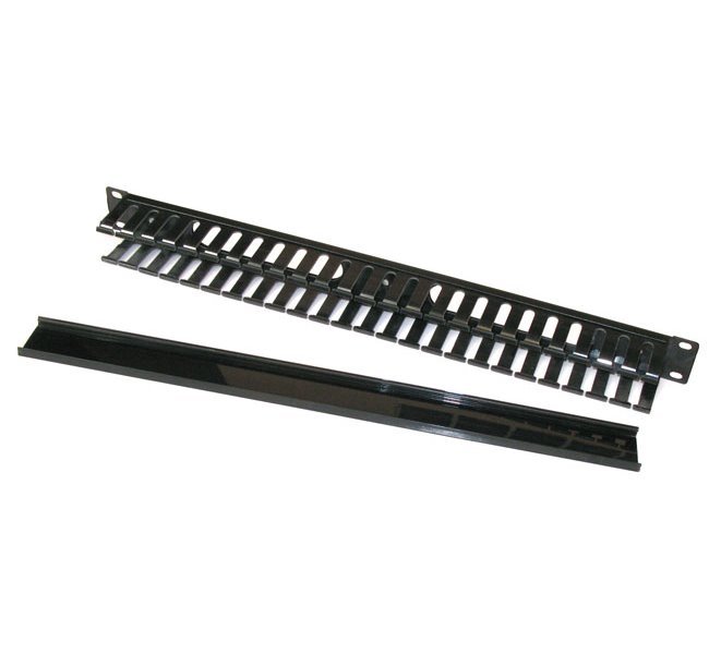 19" vyvazovací panel 1U, kovový s plastovým krytem, 40x50mm, průchozí, černý