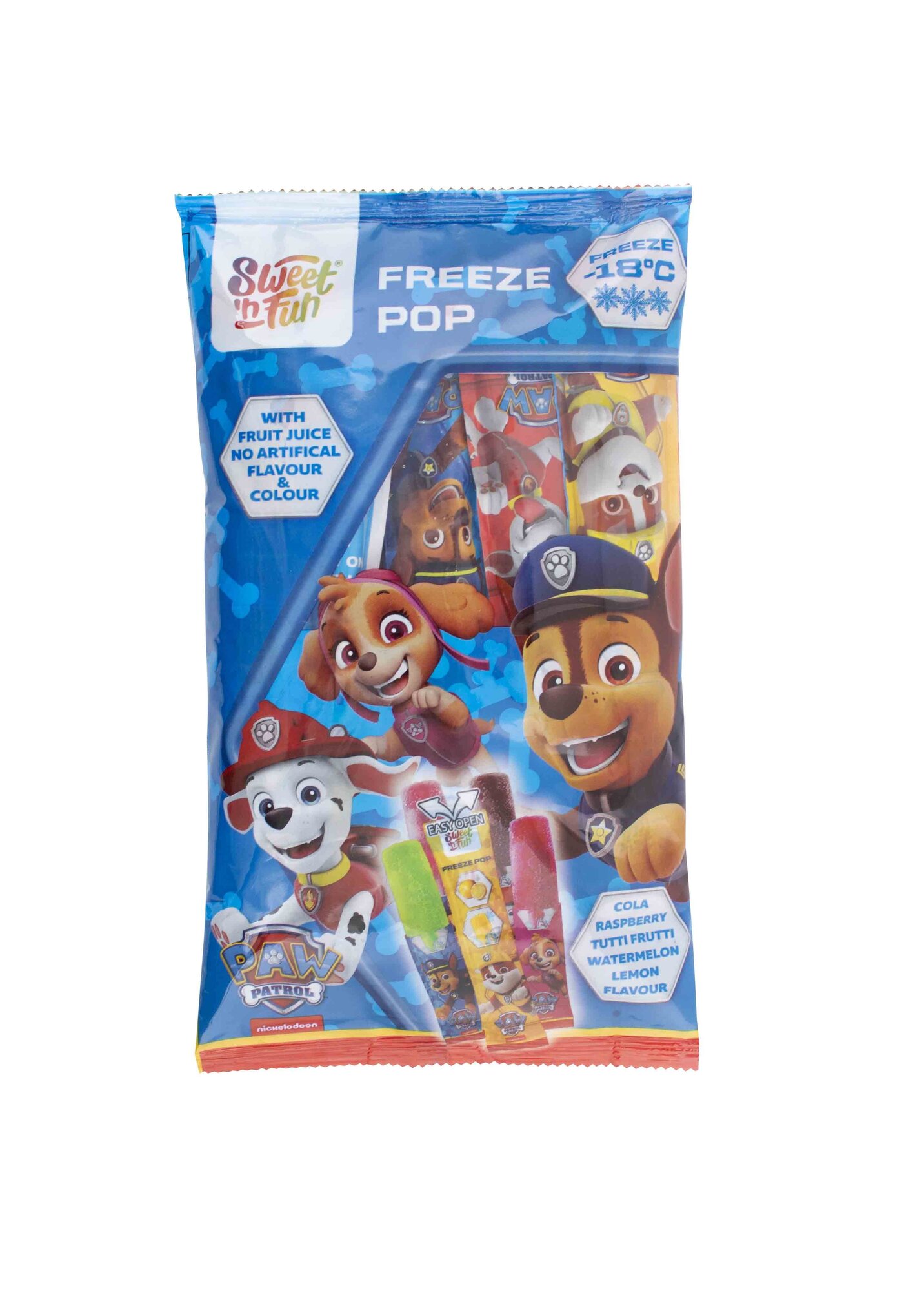 Složení: pitná voda, cukr, 2 % ovocný koncentrát (pomeranč, třešeň, limetka, jablko, citron, malina, vodní meloun); regulátor kyselosti: E330; rostlinný výtažek: černý rybíz, mrkev; přírodní aromata; stabilizátor: E466; konzervant: E202; sladidlo: E955; barviva: E141ii (vodní meloun), E150d (cola), E160a (citron). Pro získání vodové zmrzliny před konzumací protřepat a zmrazit. Po rozmrazení znovu nezmrazovat.