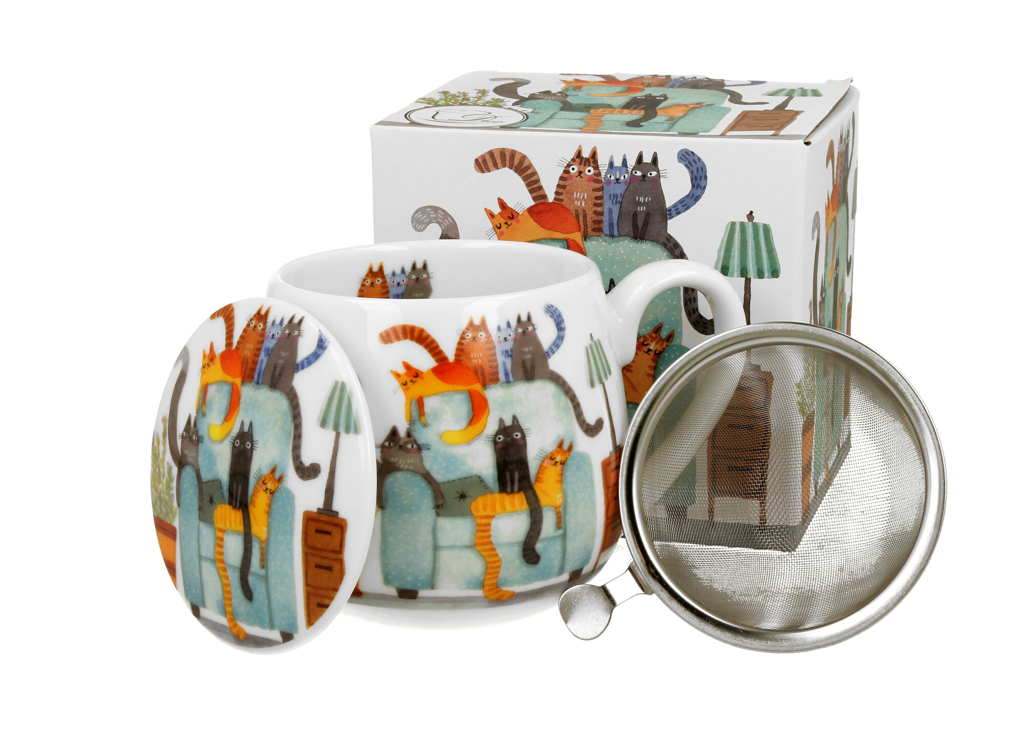 Kubek baryłka 430 ml z zaparzaczem i pokrywką Koci Świat KOTY NA FOTELU wchodzący w skład serii Animals, wykonany z porcelany New Bone China, charakteryzującej się elegancką i naturalną kremowo - białą barwą z delikatnym połyskiem, a także wyjątkową wytrzymałością.Doskonały do przyrządzania...