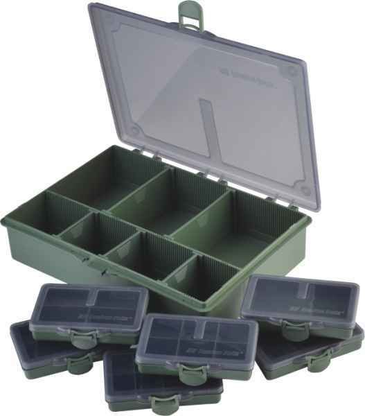 Kaprařský T box + 6 krabiček 27cm x 20cm x 5,5cm Plastový kaprařský box s nastavitelnými přihrádkami, tři krátké a dvě dlouhé. Box obsahuje šest menších krabiček pro drobnou rybářskou bižuterii. Každá z krabiček má jiný počet přihrádek a to 1,2,3,4,6,8. Všechny jsou uzavíratelné s průhledným...