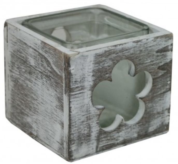 Krásný skleněný svícen v dřevěném patinovaném obalu - květina. Rozměry - 9x9x8cm. Materiál - dřevo, sklo. prečítať celé