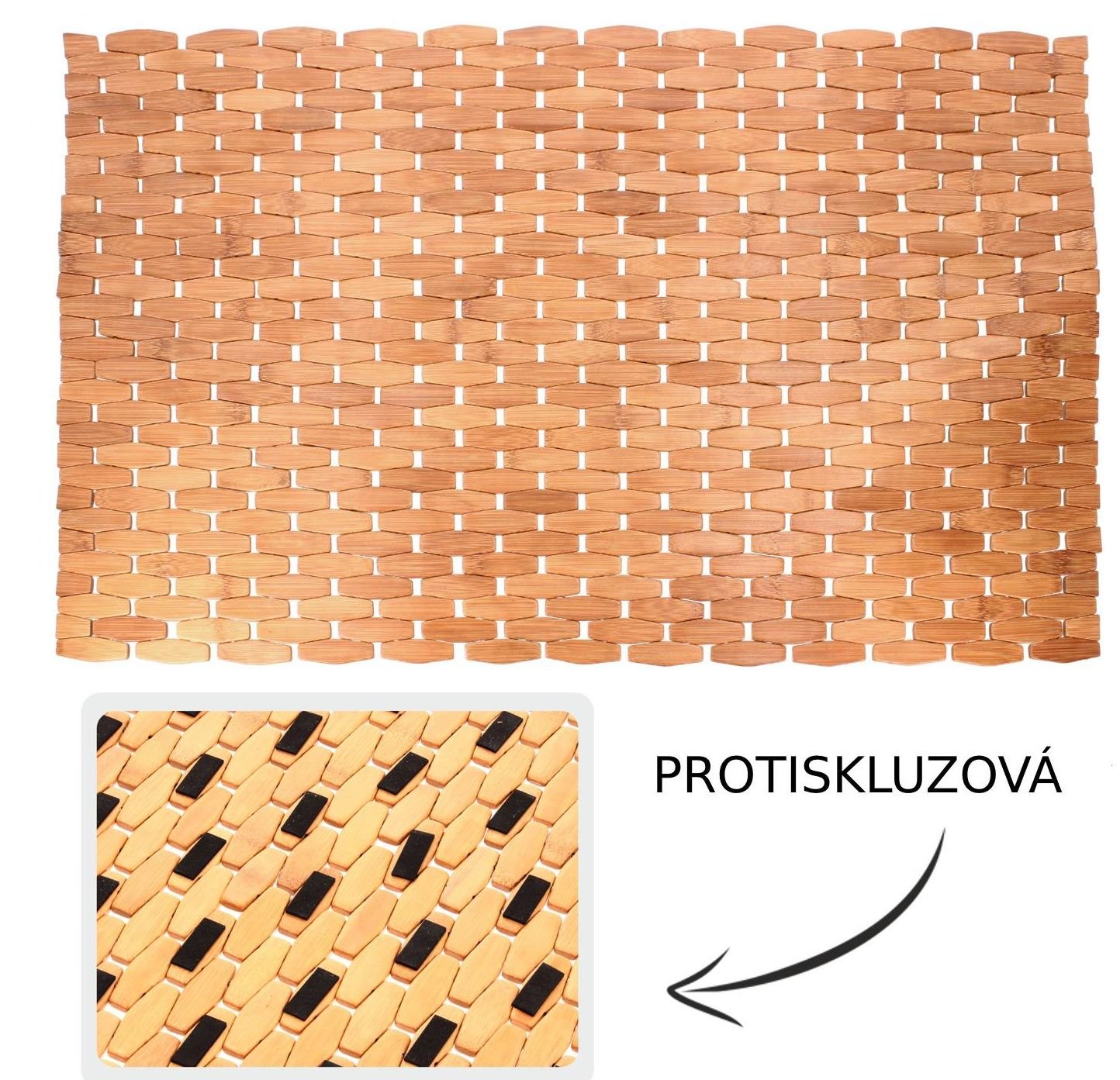 Koupelnová rohožka Grenada vyrobená z bambusu s protiskluzovými nálepkami zespodu rohože, díky kterým zajišťuje stabilitu a bezpečnost i na mokrém povrchu. Praktický a zároveň krásný dekorativní prvek do Vaší koupelny. Odolná proti vlhkosti. Vysoce kvalitní bambusové dřevo.