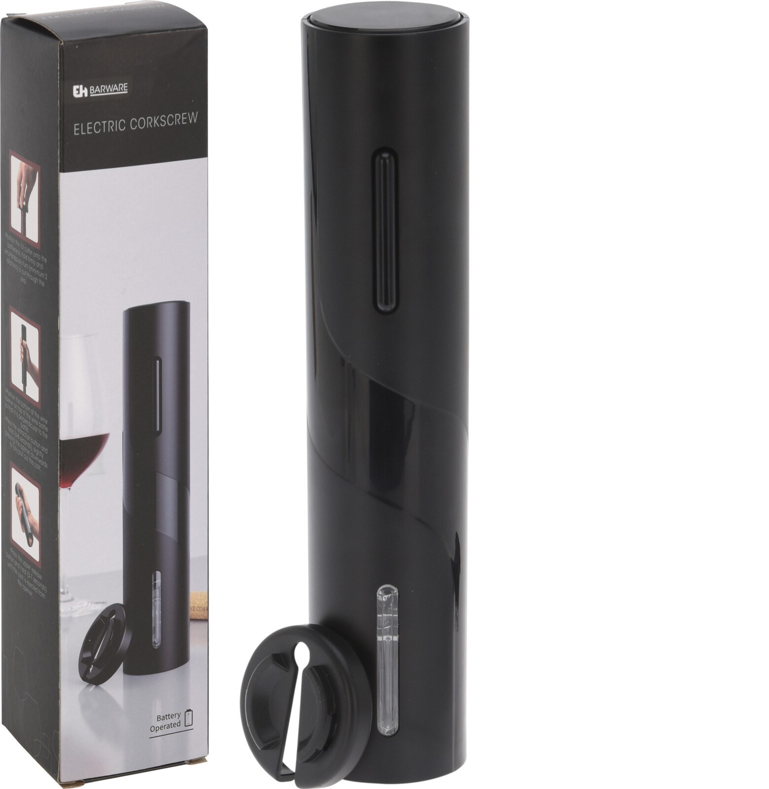 Elektrická vývrtka na víno v černé barvě je skvělý pomocník pro snadné, rychlé a bezpečné otevírání vín s korkovým uzávěrem.Baterie - 4x AA 1,5V (nejsou součástí).Materiál - plast, kov. Rozměry - výška 24 cm, průměr 4,5 cm. prečítať celé