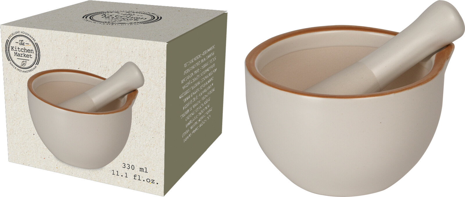 Hmoždíř s výlevkou na drcení koření, bylinek, přípravu pesta. Materiál: keramika. Vnitřní část hmoždíře a silnější strana tloučku je neglazovaná (pro lepší účinek drcení). Rozměry: vnitřní pr. 8,5 cm, vnější 10,5 cm, v. 6,5 cm, délka tloučku 12 cm, o. 0,33 l. Je vhodný do myčky.