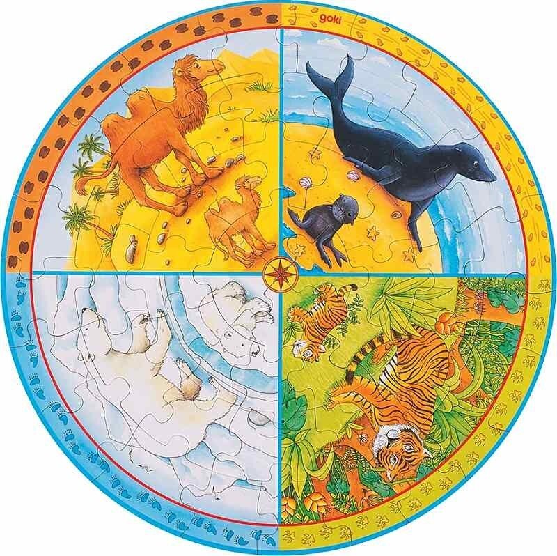 Kolorowy obrazek złożony z 45 elementów pokazujących różne zwierzęta i ich naturalne środowisko. Puzzle z tektury Cztery oblicza ziemi Goki to edukacyjna rozrywka dla maluchów, która doskonale wpływa na ich wyobraźnię. Wymiary: ∅ 45 cm prečítať celé