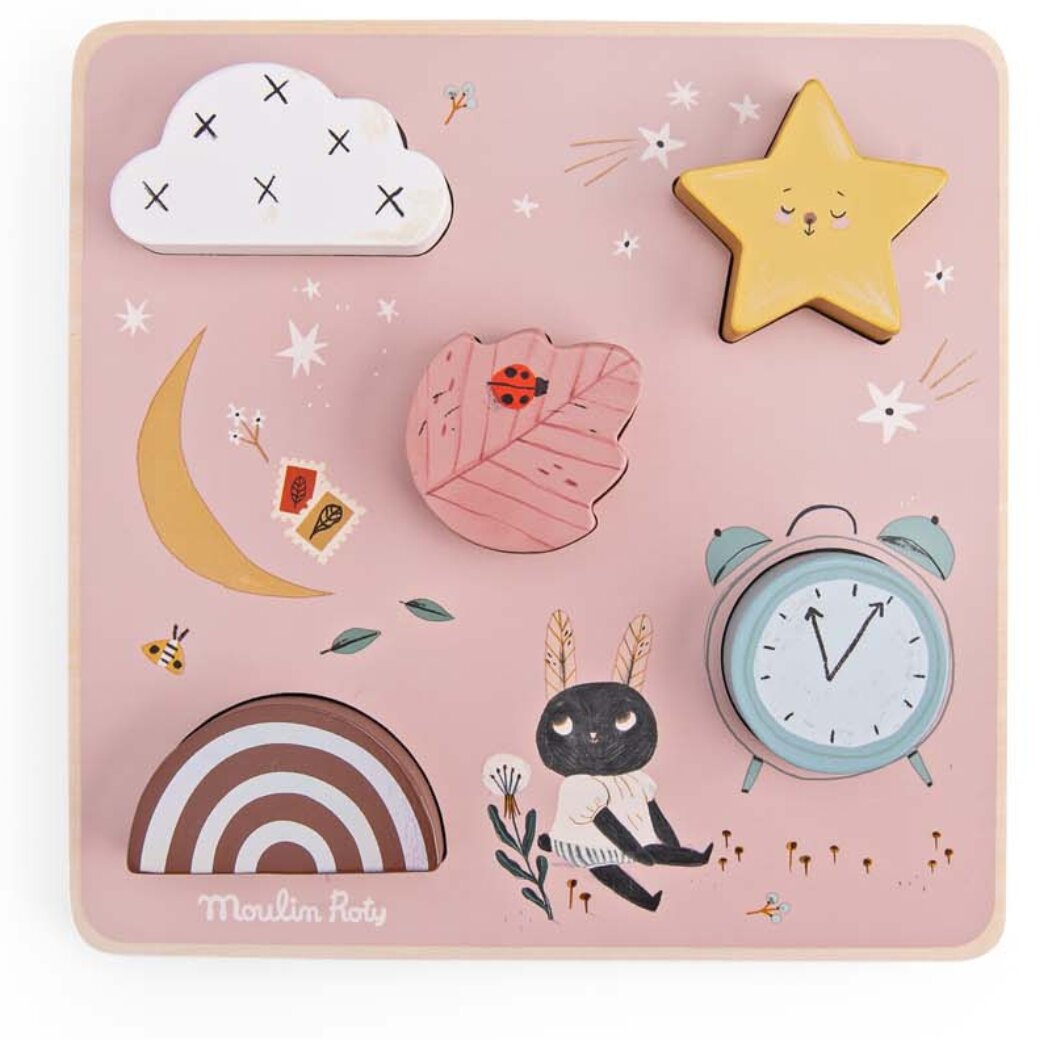 Toto puzzle z kolekce Apres la Pluie je skvělé pro malé objevitele! Každý z 5 dřevěných dílků, které se snadno zapadají do sebe, je ilustrován a skrytý pod ním se nachází překvapivé textury, které stimulují hmatové vnímání dítěte.Puzzle je ideální pro rozvoj smyslového vnímání, pomáhá dětem...