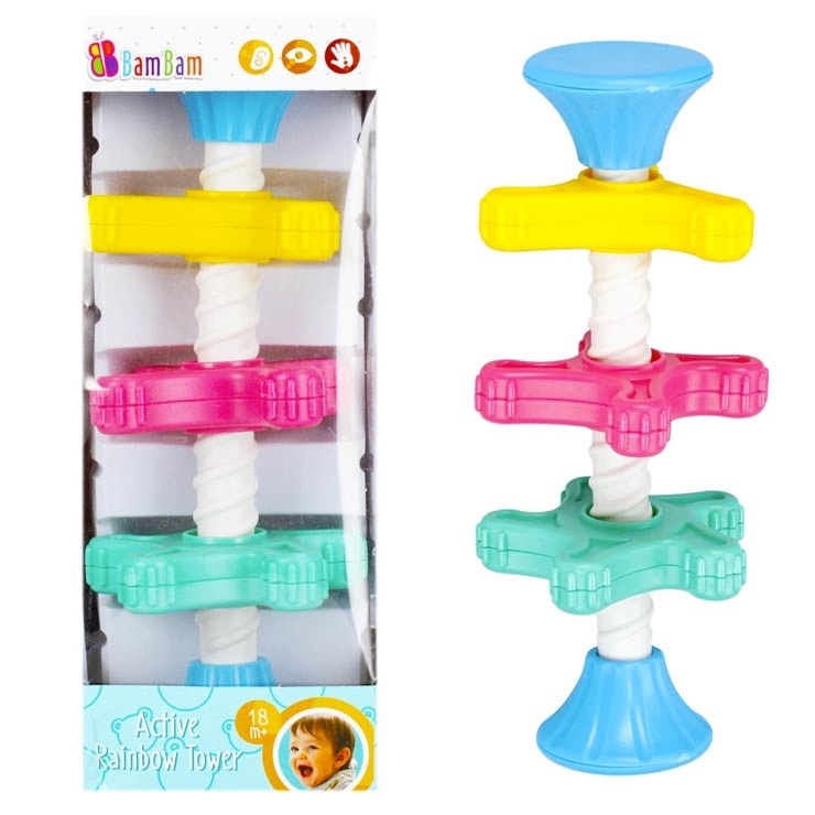 Aktivní věž BAM BAM je hračka určená pro děti od 10 měsíců věku. Duhové barvy 3 kroužků, které připomínají ořechy navlečené na šroubu přitahují pozornost dítěte, když se uvedou do pohybu. Snadnost jejich manévrování povzbuzuje dítě k jejich překládání, učí je rozlišovat tvary a podporuje jejich motoriku. Hračka je vyrobena z nejkvalitnějšího plastu, zajišťuje bezpečnou hru, bez ftalátů, v souladu s EN-71 a CE.