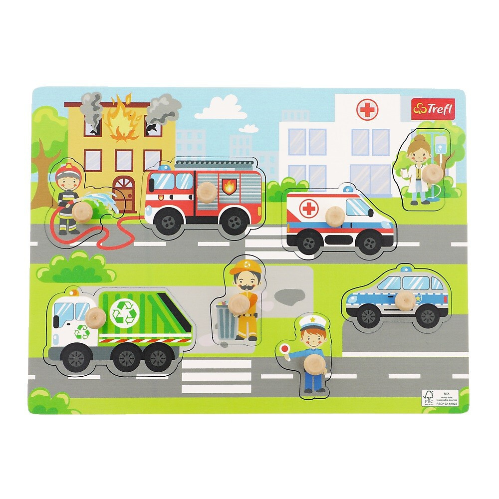 Vkládačka pro nejmenší s obrázky dopravních prostředků a postaviček oblíbených povolání. Dítě se podle obrysů a tvaru snaží najít správný obrázek (rozvoj představivosti a logického myšlení), a umístit jej do správného otvoru (rozvoj jemné motoriky). Vkládačka obsahuje osm dílků s úchytkami a podkladové obrázky.