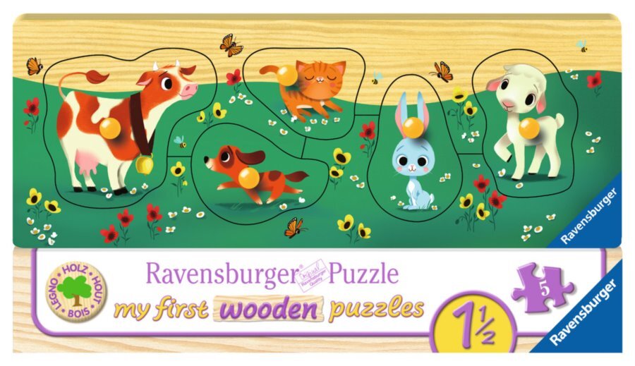 Dřevěná vkládačka s plastovými úchytkami od nejznámějšího výrobce puzzle Ravensburger.Pět vkládacích obrázků, s láskyplně ilustrovanými motivy domácích zvířat ze série Moje první dřevěné puzzle, jsou přizpůsobeny příslušnému věku.Dítě rozvíjí svoji představivost, jemnou motoriku a prostorové...