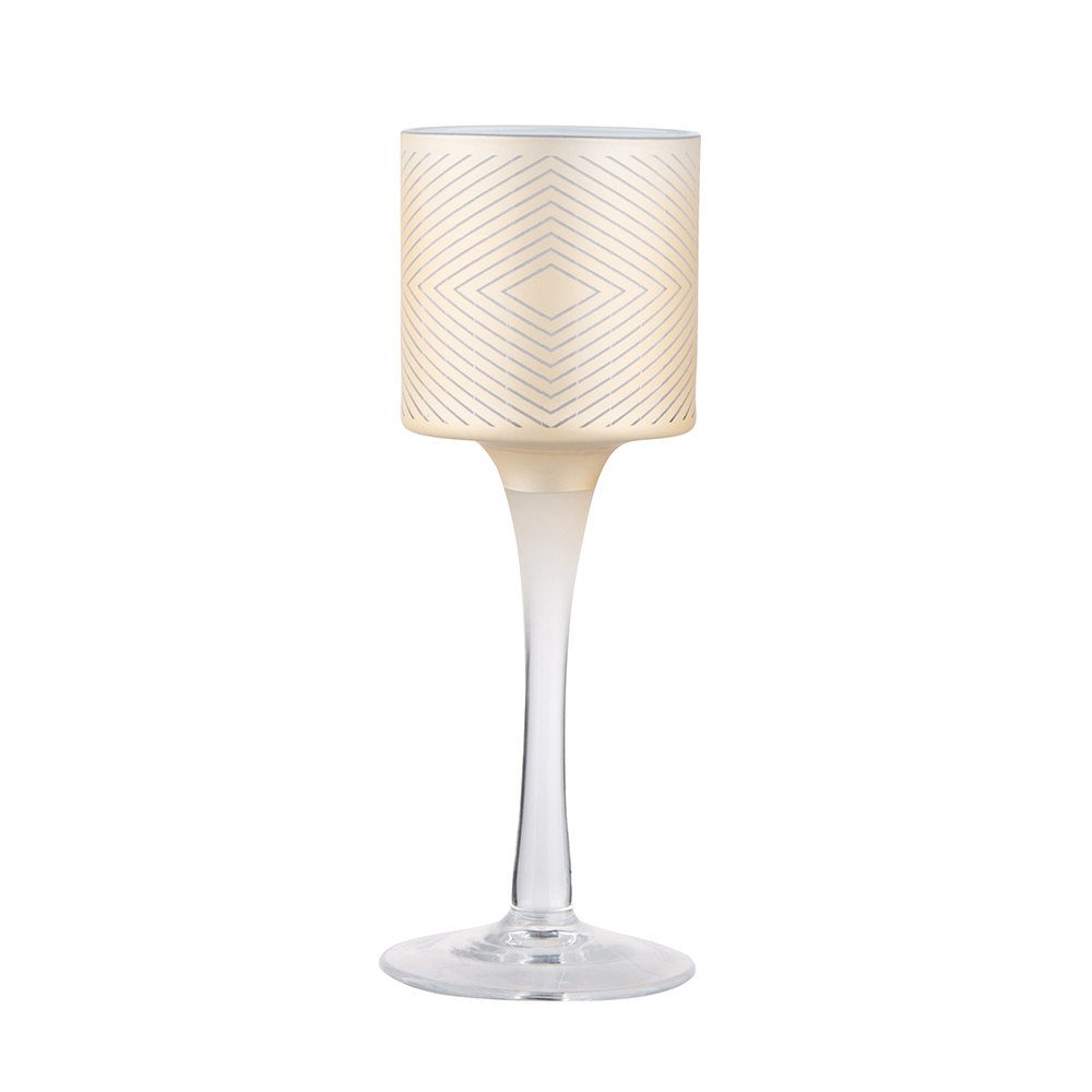 ŚKLENĚNÝ SVÍČNÍK BEŽCOVÝ S BÍLOU VNITŘNOSTÍ NA NOŽCE 7X20CM DEKORACE GEOMETRICKÁ