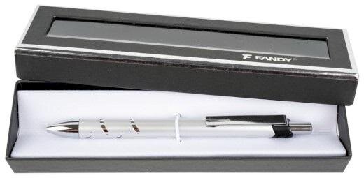 metalowy długopis automatyczny ze srebrną błyszczącą końcówką i klipem, wymienny wkład F-411, niebieski kolor tuszu, grubość linii 0,7 mm, pudełko upominkowe prečítať celé