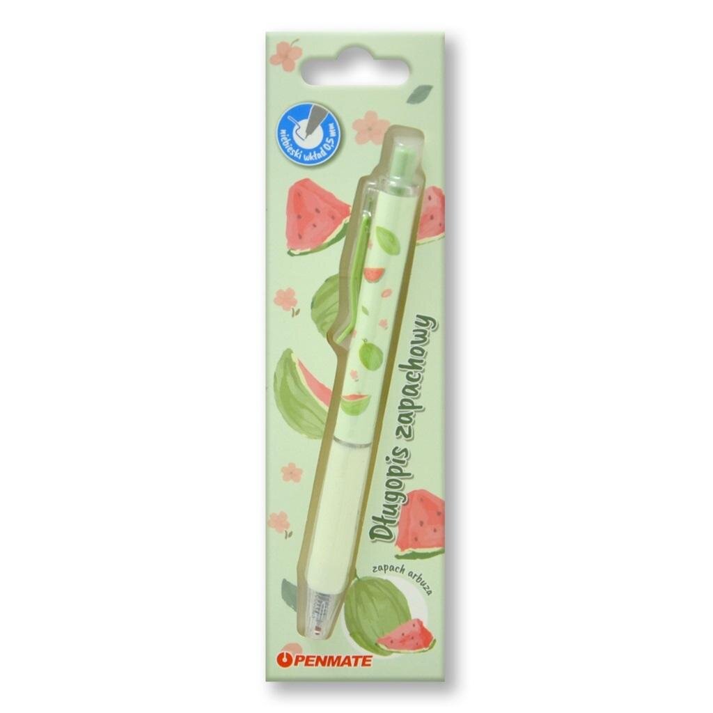 0,5 mm, która nadaje pisaniu niezwykłą miękkość. Tusz zasycha błyskawicznie, co jest ważne dla leworęcznych. Linia pisania wręcz idealna, bez pogrubień i innych znieksztaŁceń. Gumowa nasadka w części chwytowej pachnąca owocami. Zapach arbuza . Wymienny wkład w kolorze niebieskim, pasujący od długopisów Solve i Tanco oraz ścieralnych Flexi Klik.