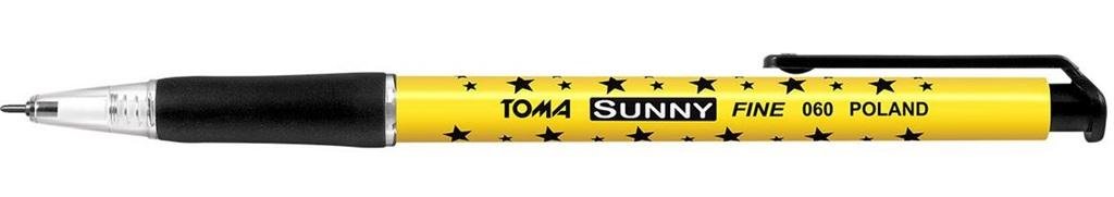 Długopis automatyczny w plastikowej żółtej obudowie w gwiazdki, klip i gumowy uchwyt w kolorze tuszu. Trwała kulka z węglików spiekanych 0,7mm. Szwajcarski wkład z tuszem gładko-piszącym do pisania po wszystkich rodzajach papieru, np. po odwrotnej stronie druków samokopiujących (faktur). 20 sztuk w opakowaniu zbiorczym.