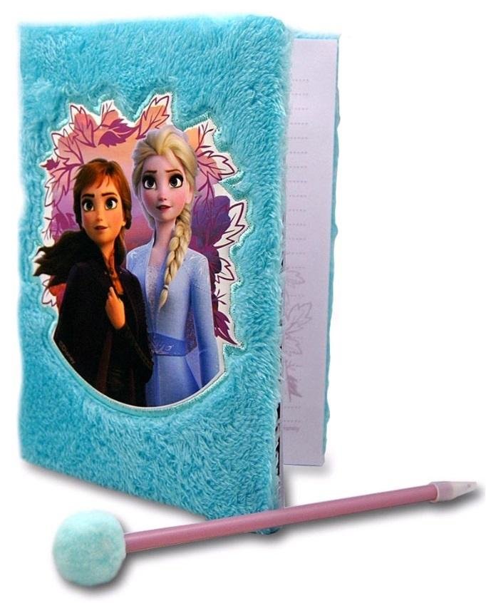 Kraina Lodu 2, Zestaw: Pluszowy Pamiętnik i Długopis z Pomponem. Uroczy 60 kartkowy pamiętnik z wizerunkiem z kultowej bajki "Kraina Lodu 2". Ozdobiony puszystym futerkiem w kolorze błękitu o rozmiarze 21 cm x 15 cm x 2,5 cm. W zestawie ponadto znajduje się piękny długopis ozdobiony futerkowym pomponem. Uwaga: zestaw zawiera małe elementy. Możliwość zadławienia.