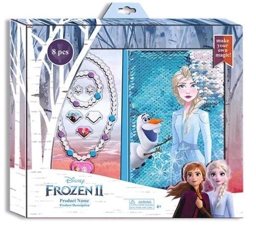 Kraina Lodu 2, Cekinowy Pamiętnik z Zestawem Biżuterii. Uroczy 80 stronicowy pamiętnik z wizerunkiem Elzy i Anny z kultowej bajki "Kraina Lodu 2". Ozdobiony błyszczącymi cekinami,które po przeciągnięciu dłonią zmieniają wygląd. W zestawie ponadto znajduje się komplet biżuterii dla małej elegantki. W komplecie znajdziemy: bransoletkę, naszyjnik, klipsy, oraz 4 barwne zawieszki.