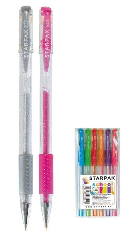 Zestaw długopisów żelowych z brokatem z kolekcji Starpak dla Szkoły. Zestaw składa się z 6 długopisów z zatyczką, w kolorach: fioletowym, czarnym, czerwonym, szarym, zielonym oraz niebieskim. Grubość linii pisania 0,7 mm. Długopisy posiadają gumowy grip, zapewniający mocny uchyt dłoni i komfort...