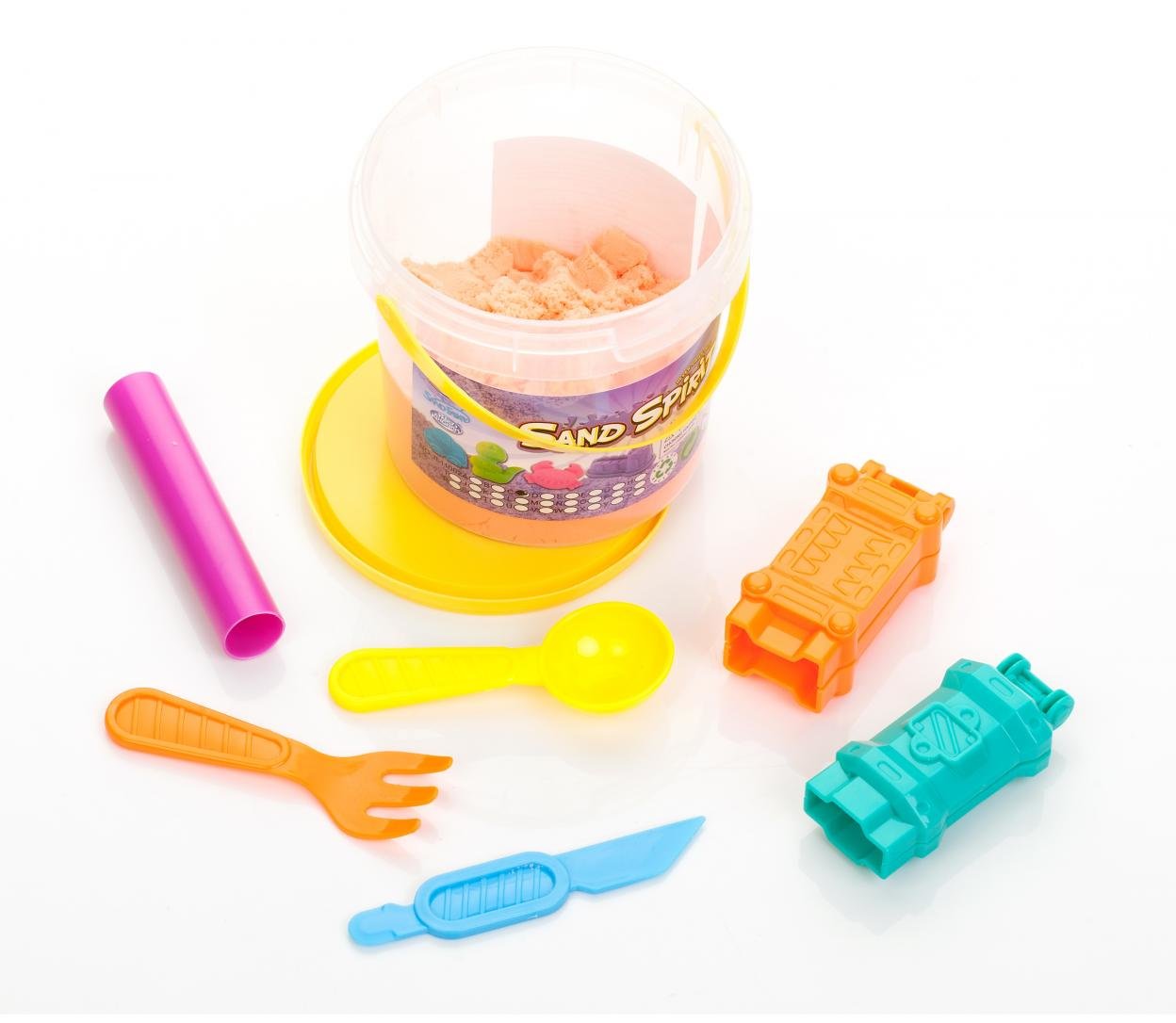 Zawartość: wiaderko z piaskiem kinetycznym 400g, 2 praski, 4 narzędzia do zabawy piaskiem