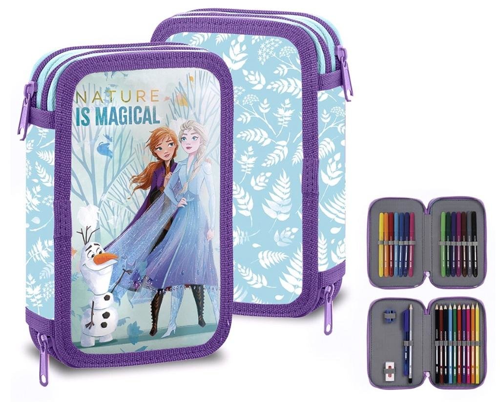 Kraina Lodu 2, Podwójny Piórnik z Wyposażeniem. Podwójny piórnik z wizerunkiem bohaterek z kultowej bajki "Kraina Lodu 2". Pierwsza komora zawiera: ołówek, długopis, komplet 10 kredek, gumkę, oraz temperówkę. Druga komora wyposażona została w komplet 14 flamastrów. Zawiera wszystko to, co potrzebne do szkoły. Wykonany ze szczególną dbałością. Wewnątrz elegancko wykończony. Przepięknie ozdobiony grafiką Elsy i Anny, wspaniały na prezent.