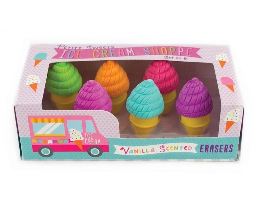 Gumki dla łakomczuchów. Ten słodki zestaw gumek do ścierania zawiera 6 kolorowych lodów na wafelku o zapachu wanilii. Słodkie lody pachnące gumki do ścierania sprawią, że dzień w szkole, w domu lub w pracy będzie o wiele słodszy.