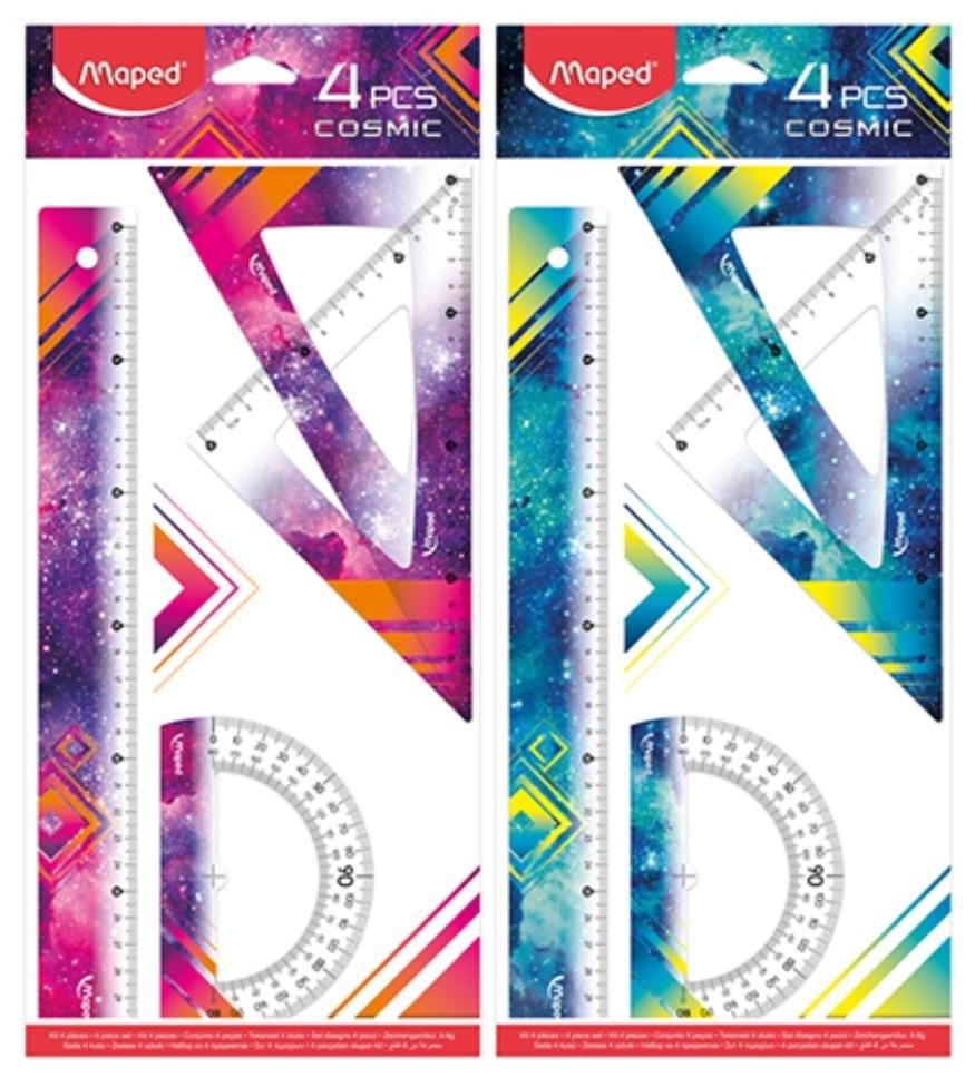 Geometryczny zestaw linijek COSMIC w skład którego wchodzą 4 elementy: linijka 30 cm, ekierka 45/21 cm, ekierka 60/21cm, kątomierz 180/12cm. Cały zestaw jest ozdobiony kosmicznymi grafikami. Dostępny w dwóch wersjach kolorystycznych.