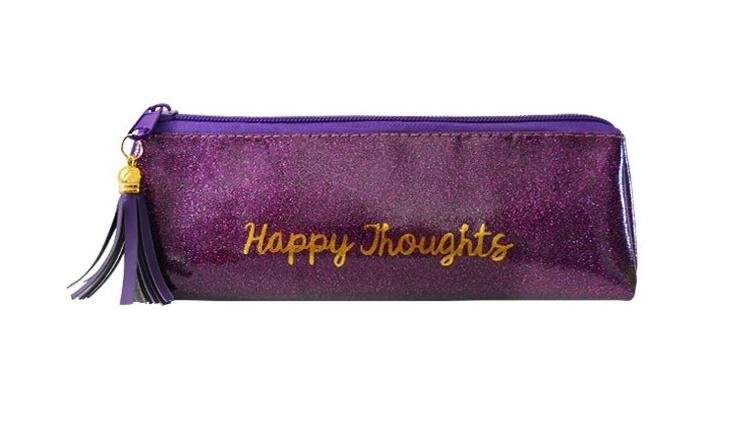 Fioletowy piórnik brokatowy z chwostem o wymiarach 4x19 oraz napisem Happy thoughts. prečítať celé