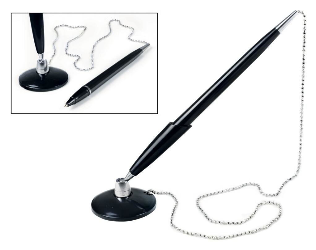 Elegancki długopis z wymiennym wkłademSamoprzylepna podstawaŁańcuszek o długości 57 cmLeżący lub stojacyNiebieski kolor wkładu prečítať celé