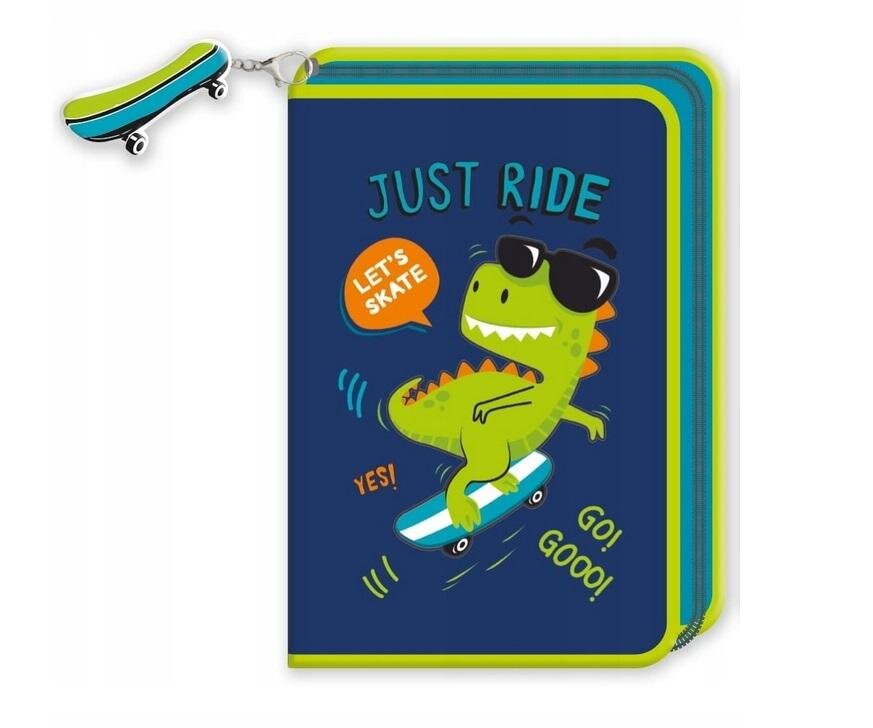 Piórnik szkolny jednokomorowy z wewnętrzną klapką z organizerem. Na piórniku nadruk dinozaura na deskorolce. Piórnik zamykany na zamek błyskawiczny, posiada wygodny gumowy uchwyt breloczek z motywem deskorolki.