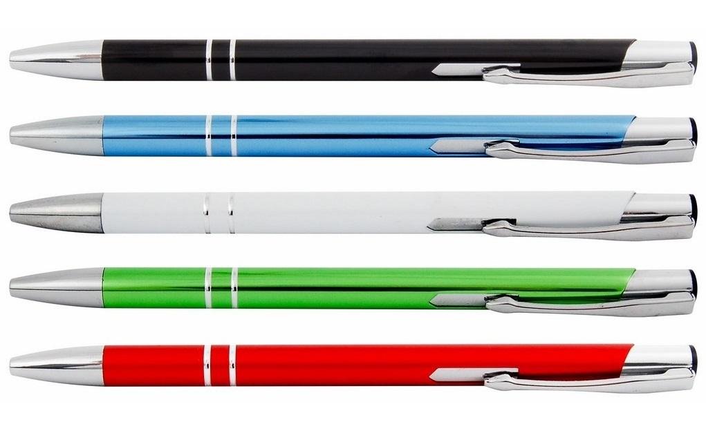 Metalowy długopis, automatyczny, srebrne dodatki, wymienny wkład F-411, niebieski kolor tuszu, grubość linii 0,7 mm, miks 5 kolorów w paczce. prečítať celé