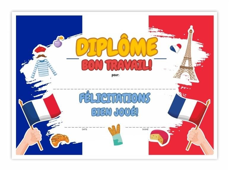 Dyplom językowy idealnie sprawdzi się jako pamiątka oraz nagroda za postępy i ciężką pracę w nauce języka francuskiego.