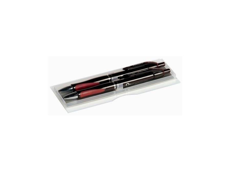 Zestaw plastikowego długopisu i ołówka automatycznego, gumowy uchwyt zapewniający wygodne trzymanie, wymienny wkład F-411 needle z igłową końcówką do bardzo cienkiego pisania, szerokość linii 0,5 mm, niebieski kolor tuszu (długopis), grafit 0,5 mm, końcówka wysuwana (ołówek automatyczny), pudełko upominkowe.