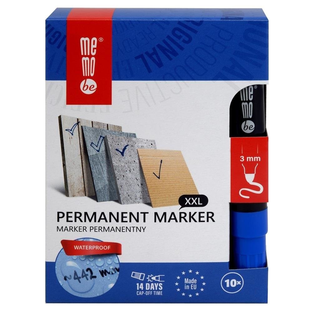 Opakowanie zbiorcze 10 sztuk.Marker permanentny MemoBe z tuszem w kolorze niebieskim i okrągłą końcówką w rozmiarze 3 mm. Przeznaczony do trwałego znakowania prawie wszystkich powierzchni, jak np.: kartonu, szkła, metalu, plastiku, drewna itd. Wodoodporny i szybkoschnący tusz o słabym zapachu....