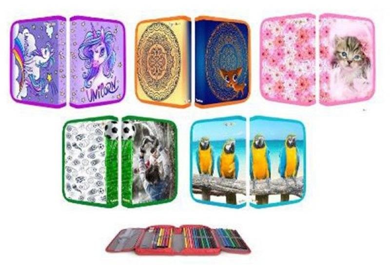 Miks wzorów wysyłany losowodwustronnyjedna komoradwie przekładki z dodatkowymi kiszonkamiz zamkiem błyskawicznymz wyposażeniem : 32 elementyw skład wyposażenia wchodzą:kredki ołówkowe, sześciokątne, 12 kolorówflamastry plastikowe, 12 kolorów, tusz nietoksyczny, grubość 1,0mmołówek drewniany, HB,...
