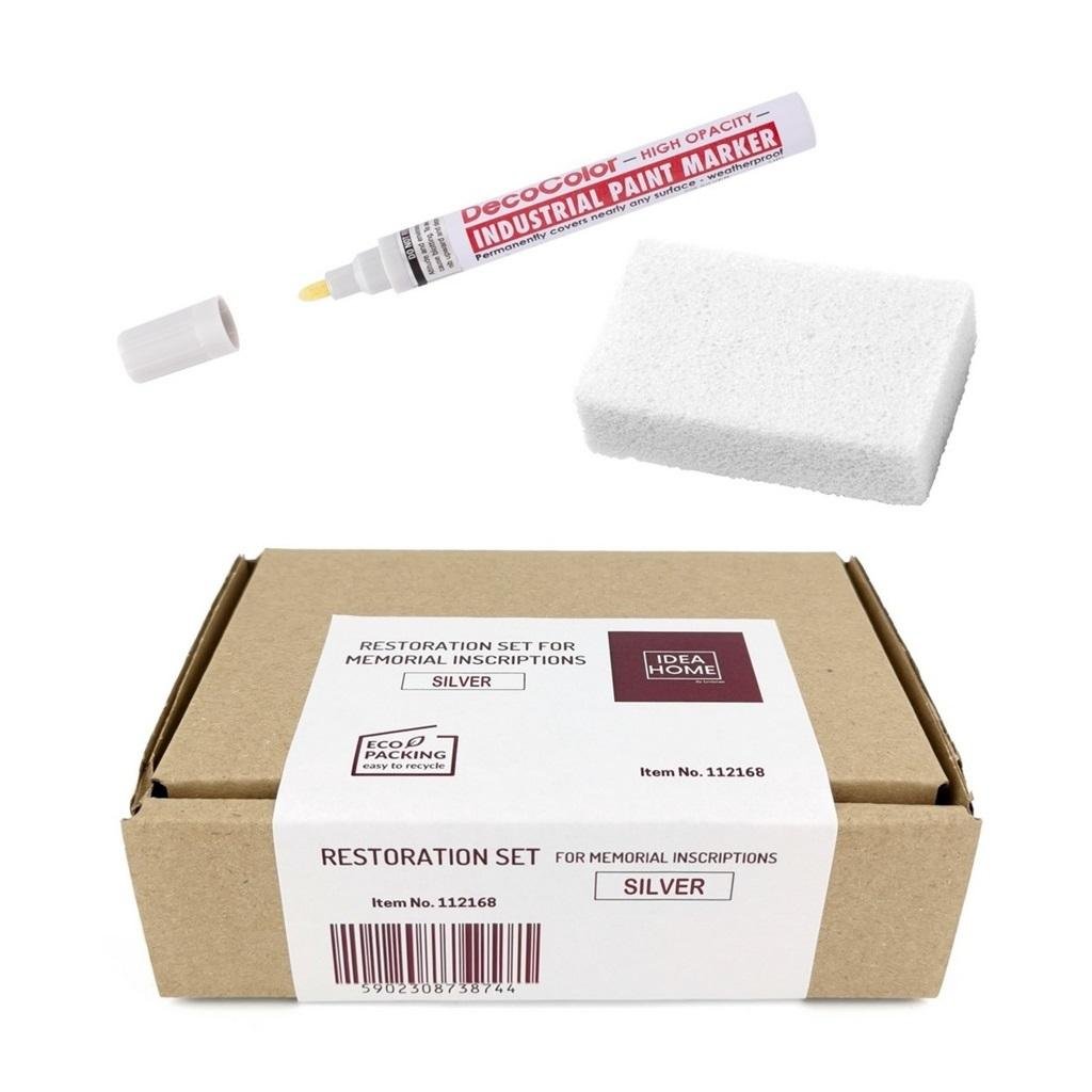 W komplecie znajduje się pumeks szlifierski, marker olejowy w kolorze srebrnym oraz instrukcja użytkowania.