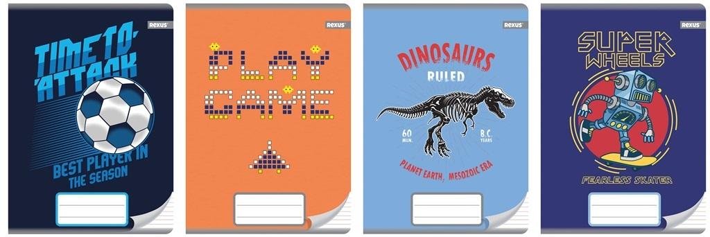 Zeszyt A5, posiada 16 kartek o gramaturze 70 g/m2 w 3 kolorowe linie. Charakteryzuje się estetycznym, lakierowanym wykończeniem i okładką idealną dla chłopca. Na zewnętrznej stronie okładki: imiennik - miejsce na wpisanie imienia, nazwiska, klasy.