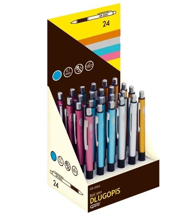 Opakowanie zbiorcze 24 sztuki.Długopis utomatyczny z wymiennym wkładem:ergonomiczna obudowa z uchwytem antypoślizgowym,indywidualny kod kreskowy w formie naklejki usuwalnej bez śladu,tusz wodoodporny,długość pisania: 1000 m,grubość linii 0,7 mm,niebieski kolor tuszu. prečítať celé