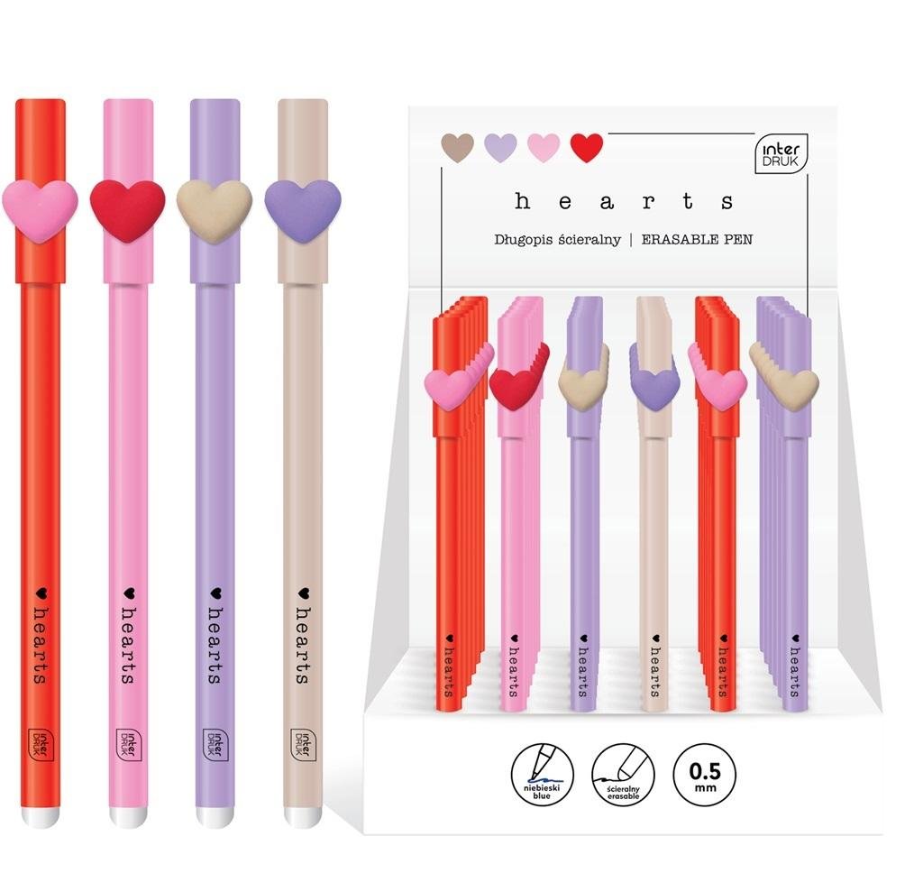 Długopis ścieralny zamykany na skuwkę z serduszkiem. Grubość pisania: 0.5 mm. Niebieski wkład. Zakończony gumką, która umożliwia szybką i estetyczną korektę napisanego tekstu, bez użycia korektora czy przekreślania. Miłe w dotyku wykończenie soft touch. 4 wzory do wyboru. 36 szt. w displayu.