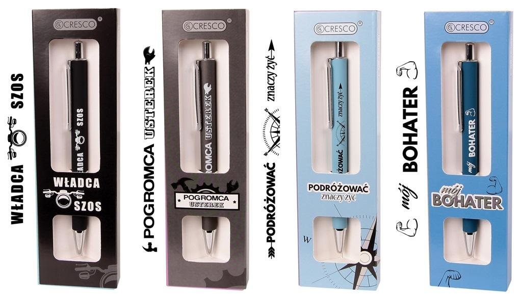 Kolorystyka męska ze srebrnymi wykończeniami. Nadruk to 4 MOTTA: "Władca szos", "Pogromca usterek", "Podróżować znaczy żyć", "Mój bohater". Dodatkowo wzbogacony nadruk o wyjątkową grafikę. Długopis zapakowany w prezentowe etui GB, w sam raz na upominek dla NIEGO.
