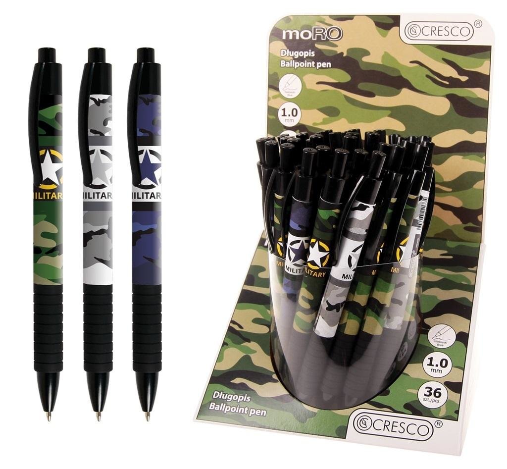 Długopis SERIA MORO nowość CRESCO. Ponadczasowe wzornictwo długopisu czyni go wyjątkowym i uniwersalnym dla każdego. Wykonany został z plastiku, uchwyt natomiast jest softowo-gumowy. Mechanizm włączania pstrykany, wkład typu X22, grubość linii pisania 1mm. W opakowaniu zbiorczym 36 szt - mix 3 wzorów.