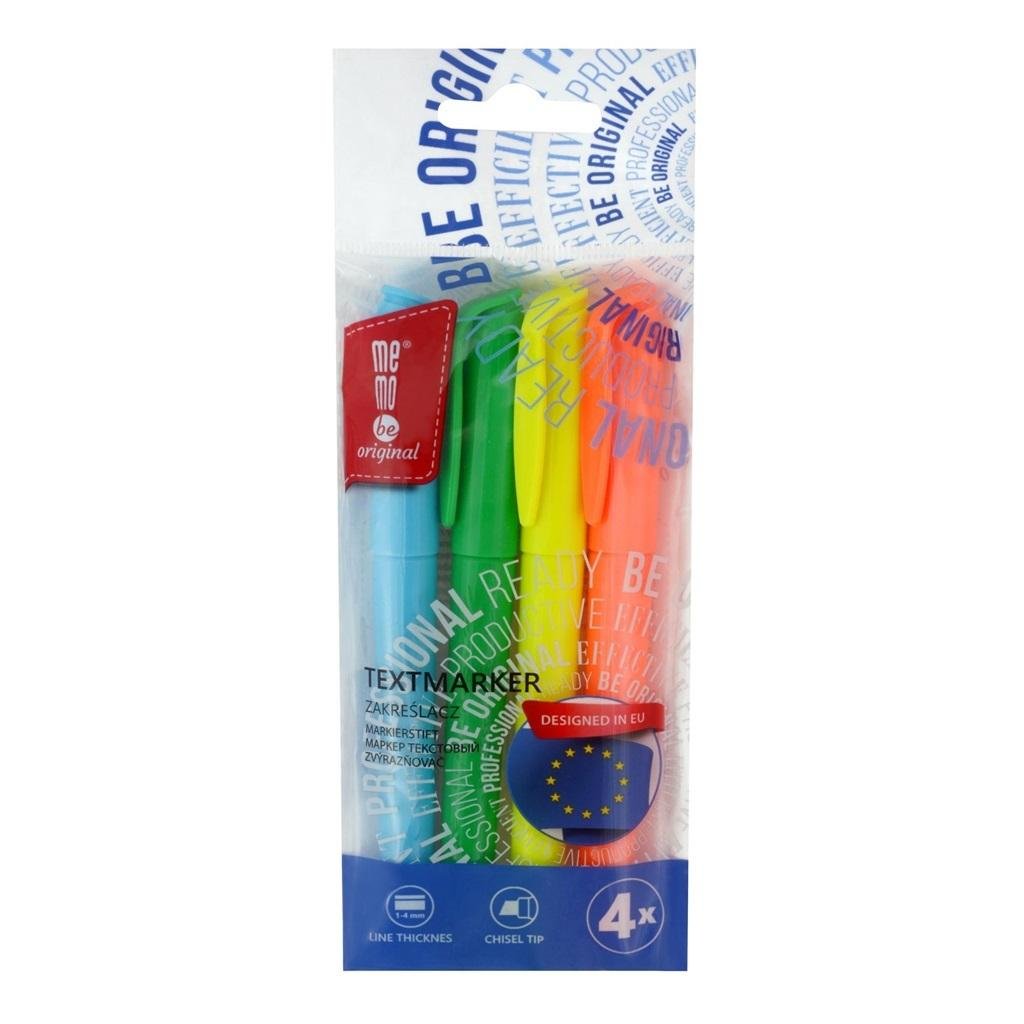 Zakreślacze MemoBe. Zakreślacze w pisaku ze ściętą końcówką. Idealne do zakreślania fragmentów tekstu i notatek. Obudowa wykonana z tworzywa w kolorze tuszu, z zatyczką z klipsem. Tusz na bazie wody w jasnych, intensywnych kolorach neonowych. Grubość linii pisania 1-4 mm. Zestaw 4 szt. w różnych kolorach w etui z zawieszką.