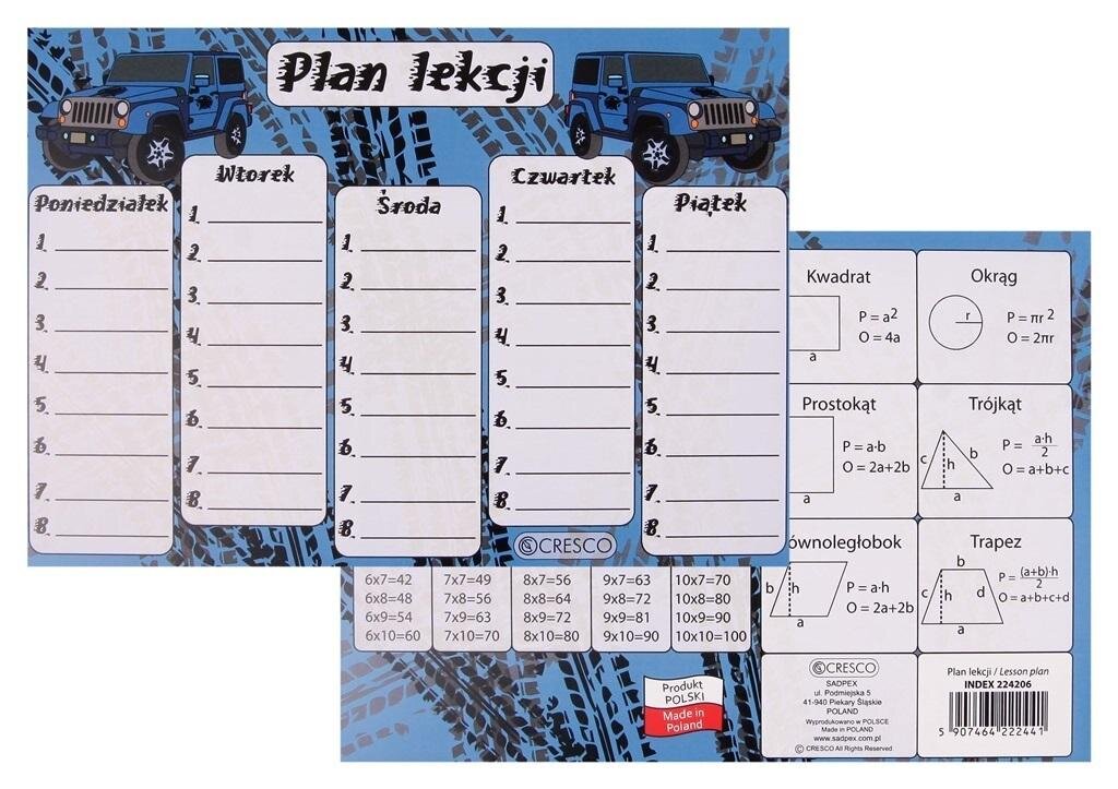 Plan lekcji dla ucznia o ciekawej grafice w formacie A5. Zawiera miejsce do samodzielnego uzupełnienia na pięć dni zajęć szkolnych. Z tyłu tabliczka mnożenia oraz podstawowe wzory matematyczne. Zapakowany w opakowanie zbiorcze - folię po 25szt. prečítať celé