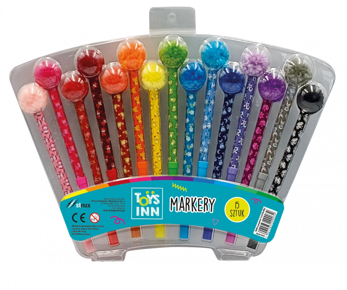 Zestaw 15 mazaków z kolorowymi pomponami. Mazaki mają intensywne barwy i są idealne do rysowania, pisania i kolorowania na papierze prečítať celé