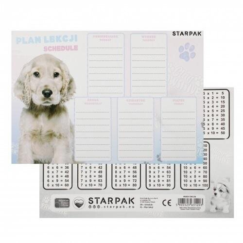 Opakowanie zbiorcze 25 sztuk.Plan lekcji jest niezbędnym elementem wyposażenia szkolnej wyprawki. Plan z kolekcji STARPAK Cuties Pieski, zawiera podział na pięć dni tygodnia z 8 wierszami do wpisu, dzięki czemu żaden uczeń nie zapomni o potrzebnych mu danego dnia książkach czy zeszytach,...