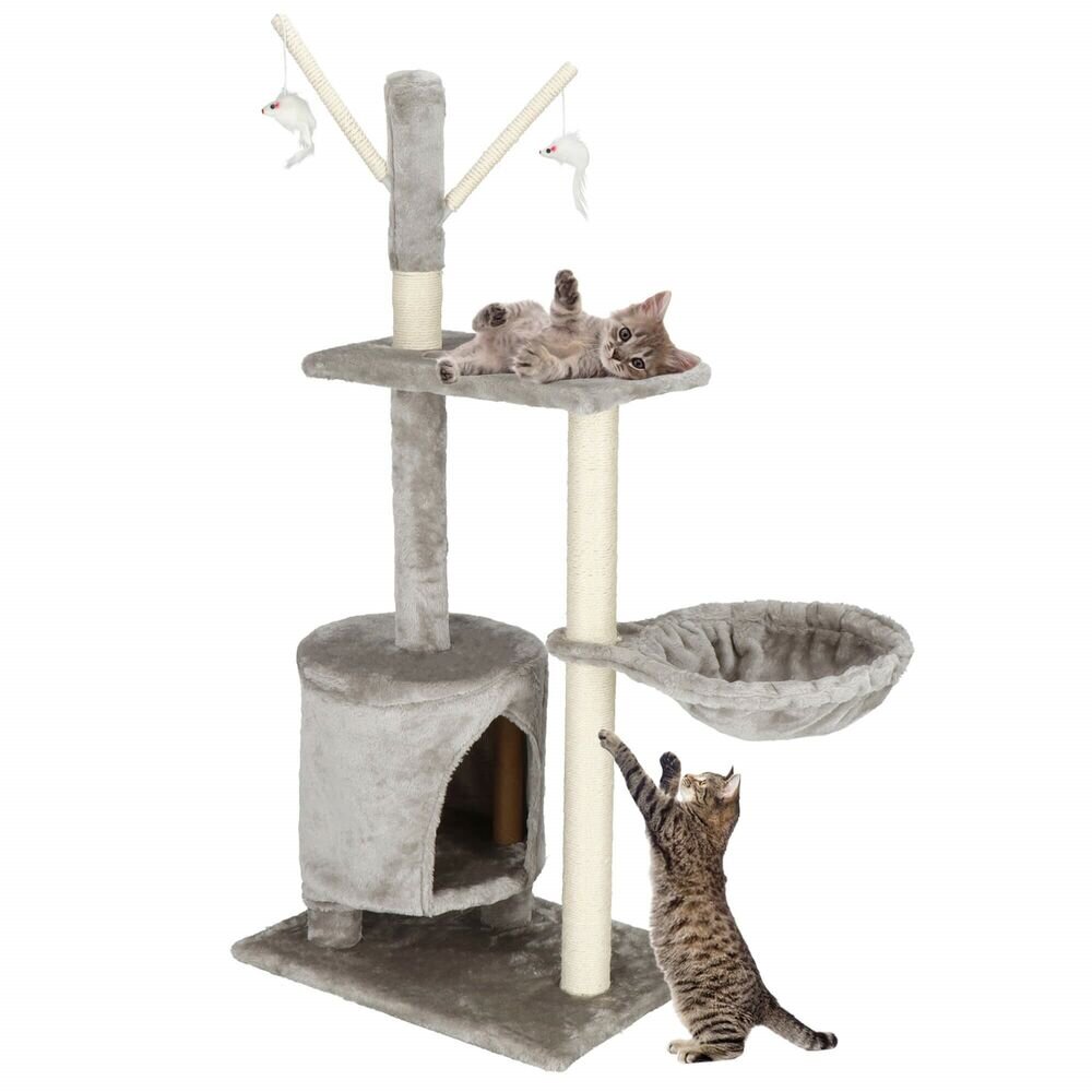 Toto viacúrovňové škrabadlo má štyri poschodia, ktoré zaujmú vašu mačku svojou variabilitou a útulnosťou. Je doplnené o mäkký poťah, ktorý zaručuje komfort pri odpočinku, a veľmi stabilnú konštrukciu, vďaka ktorej sa nemusíte obávať prevrhnutia pri energickom skákaní. Sisalové tyče sú výborné na údržbu mačacích pazúrikov a na uspokojenie prirodzenej potreby škrabania. Navyše sú súčasťou hračky dve myšky na elastickom povraze, ktoré pobavia každú mačku a lepšie tak zabavia jej myseľ i telo. Nechýba ani útulný domček a vyvýšená posteľ, kde môže vaša mačka nerušene odpočívať a pozorovať okolie z bezpečnej výšky.