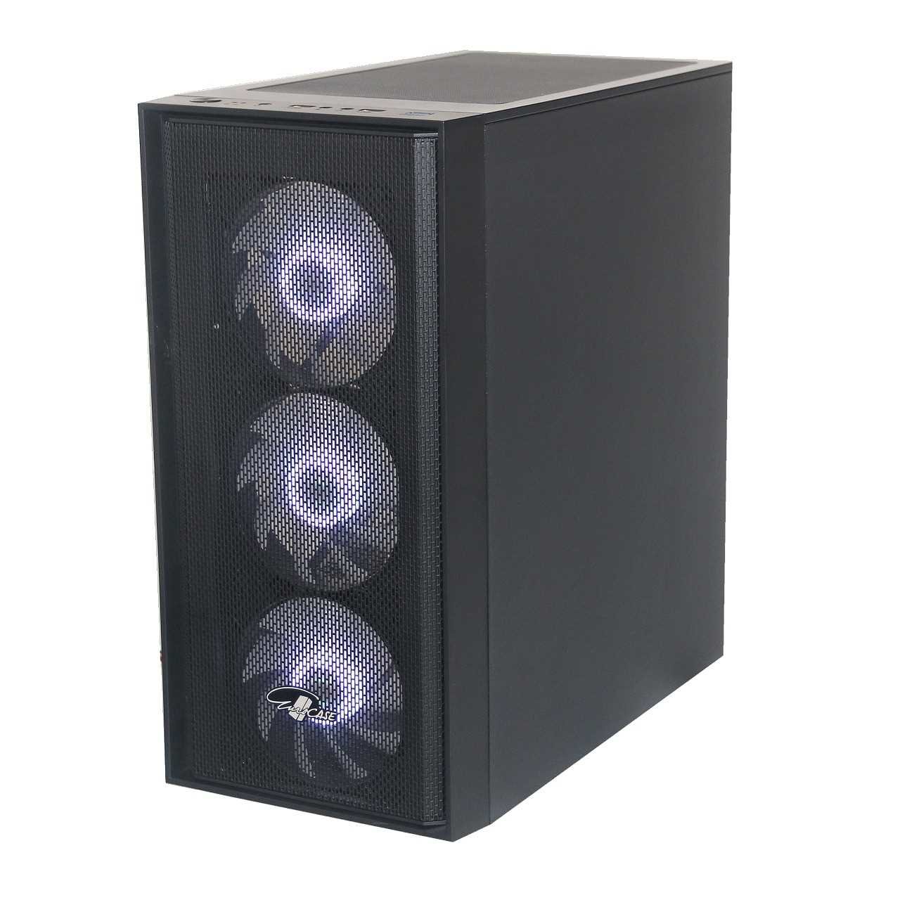 Počítačová skříň se skleněným bočním krytem a RGB ventilátory.