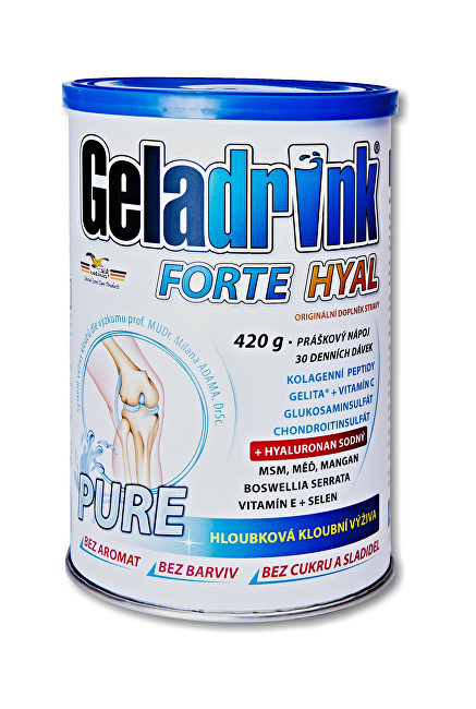 Geladrink FORTE HYAL je špeciálne vyvinutý práškový doplnok stravy, ktorý spája kolagénové peptidy Gelita 3000Da, známe pre svoju vysokú vstrebateľnosť, s glukosamín sulfátom a chondroitín sulfátom, ktoré prispievajú k udržaniu správnej funkcie kĺbov. Ďalej je obohatený o hyaluronát sodný na podporu vláčnosti tkanív, MSM, Boswellia Serrata a antioxidanty ako vitamíny C a E, selén, mangán a meď. Toto komplexné zloženie pomáha nielen chrániť kĺby, ale aj podporovať zdravú pokožku a celkovú pohodu.