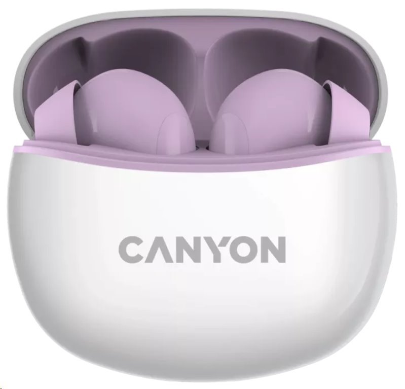 CANYON TWS-5 BT sluchátka s mikrofonem, BT V5.3 JL 6983D4, pouzdro 500mAh+40mAh až 38h, šeříková