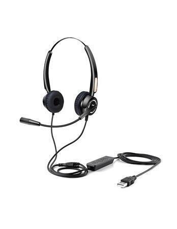 USB náhlavní sluchátka s mikrofonem s ovladačem na kabelu. Náušníky poskytují přirozenou zvukovou izolaci.