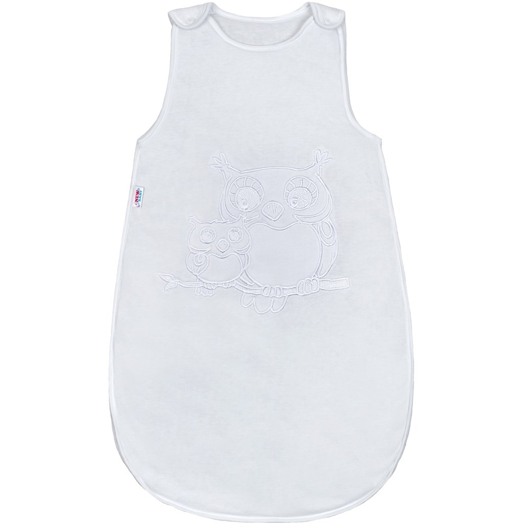 Dětský spací pytel New Baby Sovičky. Spací pytel je vyplněn hypoalergenním vláknem a má na sobě vyšitý velký roztomilý obrázek soviček. Zapínání na ramínkách na cvočky a na boční a spodní straně je zip. Rozměr: obvod kolem hrudníku cca 70cm, délka od ramínek cca 77 cm. Složení: povlak 100% bavlna, výplň: 100% polyester.